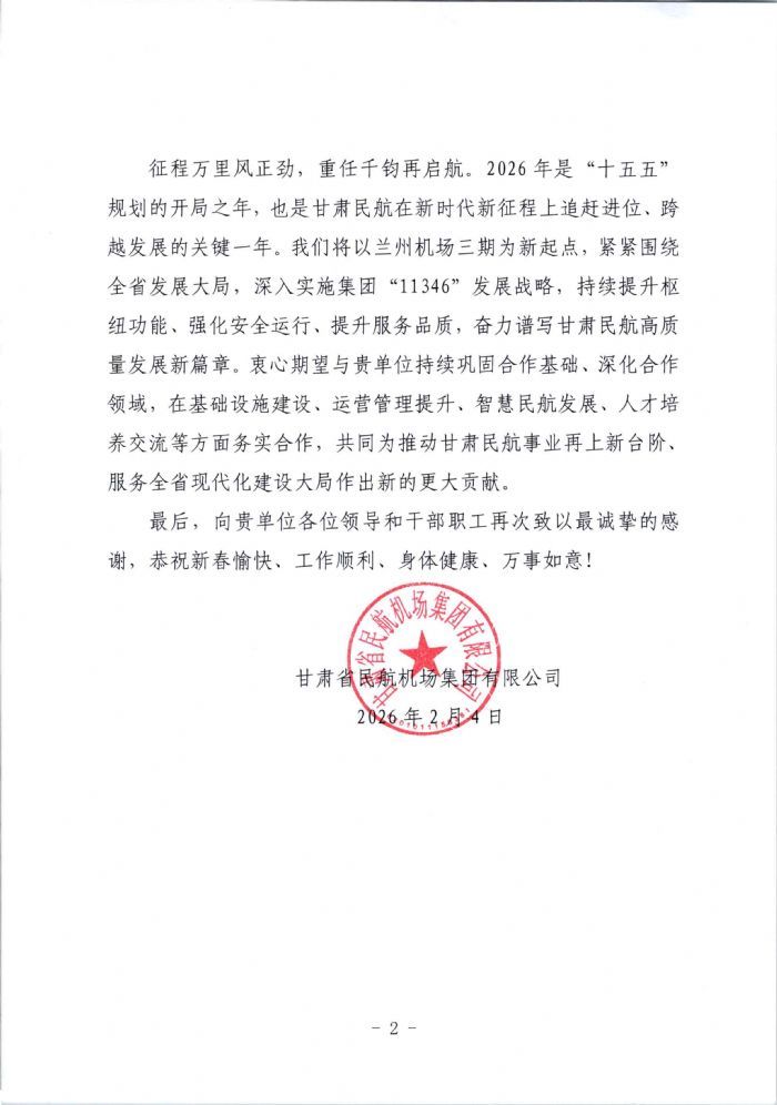 巳蛇岁末,捷报频传。甘肃省民航机场集团有限公司、西部机场集团有限公司机场建设指挥部相继向我集团发来感谢信,高度赞誉集团公司在兰州中川国际机场三期扩建工程、西安咸阳国际机场三期扩建工程建设中作出的突出贡献,向集团公司全体干部职工致以新春的美好祝福。