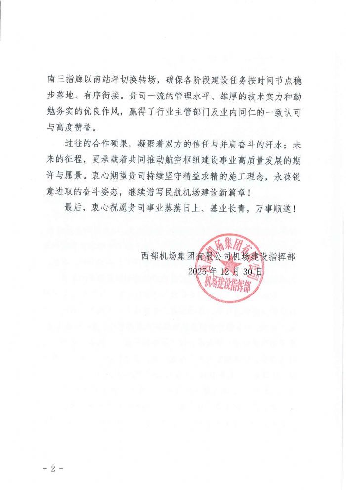 在西安咸阳国际机场三期扩建工程建设中,集团公司作为核心施工单位,始终与西部机场集团有限公司机场建设指挥部同心同向、同频共振、协同发力。以高度的政治担当、过硬的专业素养、务实的工作作风,高效推进工程建设各项工作,为三期工程顺利收官筑牢坚实基础,为西安咸阳国际机场航空枢纽功能完善与提档升级作出卓越贡献。西部机场集团有限公司机场建设指挥部特在信中向我集团公司致以最诚挚的感谢与最崇高的敬意。