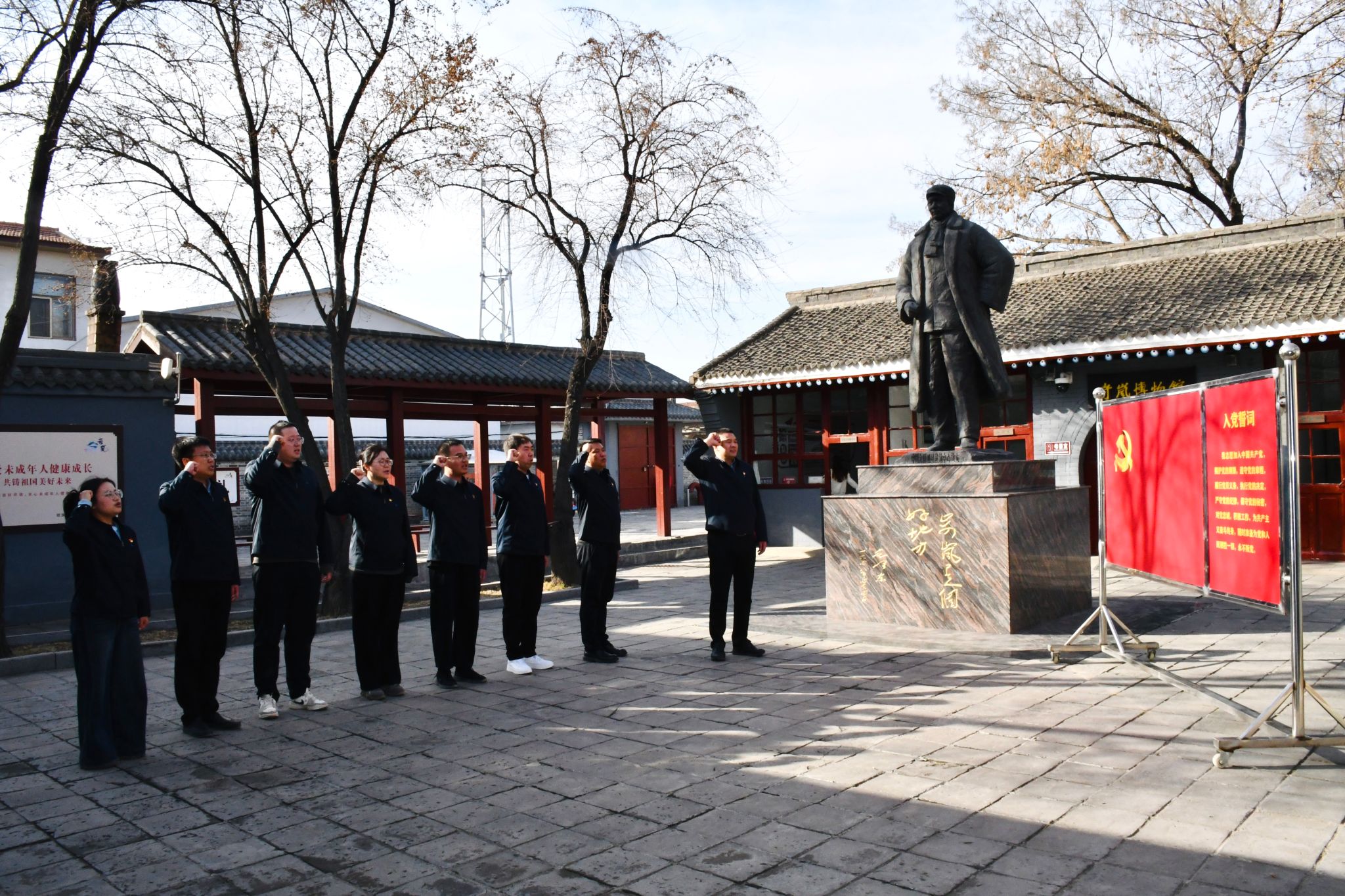 岢岚毛主席路居馆,党员参观革命实物、历史图片与文献史料,聆听历史讲解,重温峥嵘岁月,深刻感悟革命先辈的初心使命和奋斗精神。全体党员庄严宣誓,在红色洗礼中坚定理想信念、凝聚奋进力量。[1948年,毛主席率领中央机关转战西柏坡途中曾在此路居,留下“岢岚是个好地方”的深情赞誉]