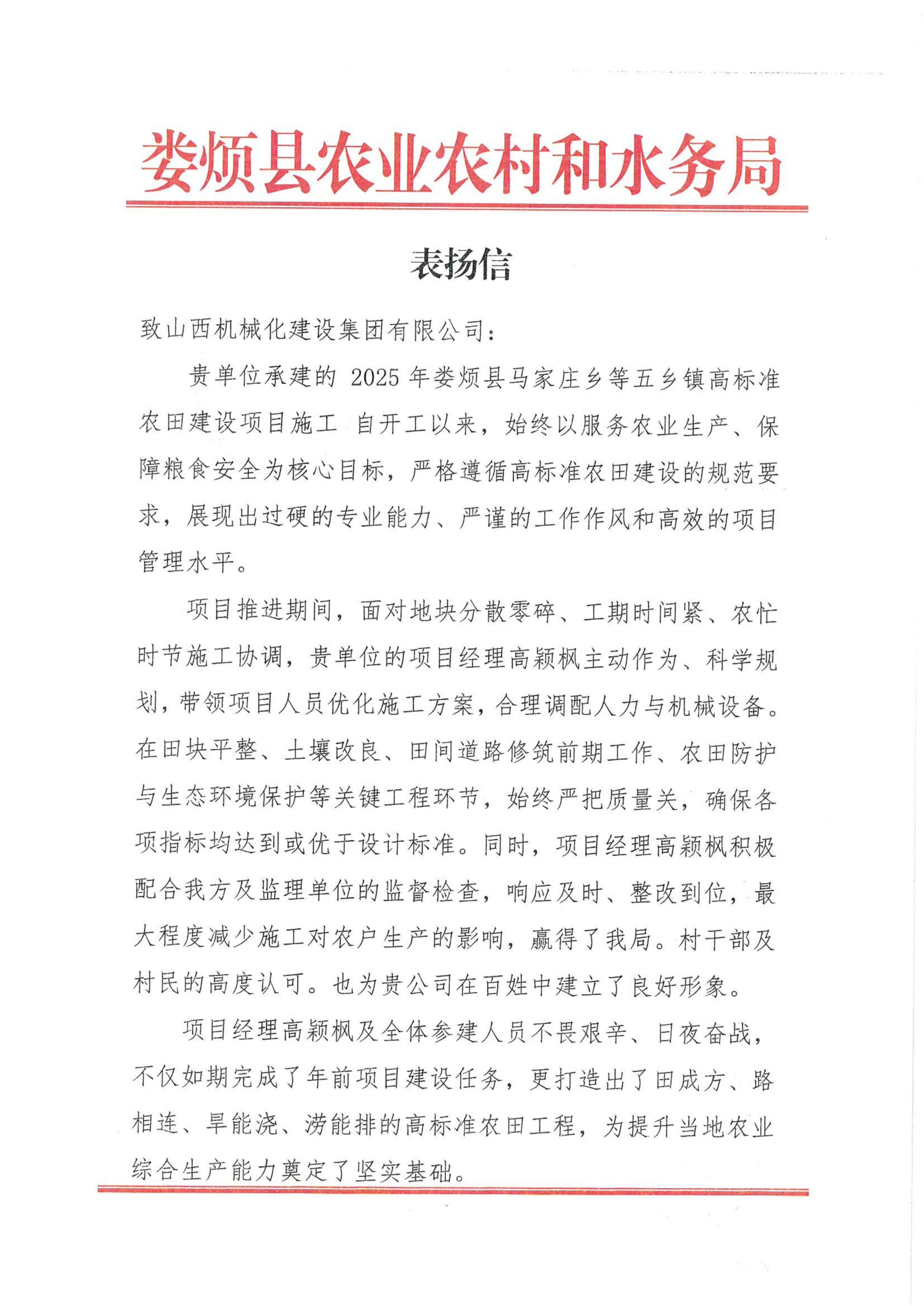 隆冬时节,饱含深情的锦旗、表扬信、感谢信纷至沓来,山西机械化建设集团多个项目受到各方盛赞。娄烦县农业农村和水务局在表扬信中写道,马家庄乡等五乡镇高标准农田建设项目自开工以来,始终以服务农业生产、保障粮食安全为核心目标,不仅如期完成项目建设任务,更打造出了田成方、路相连、旱能浇、涝能排的高标准农田工程,为提升当地农业综合生产能力奠定了坚实基础。山西汾飞水土资源开发有限公司对集团公司承建的杜交曲镇...