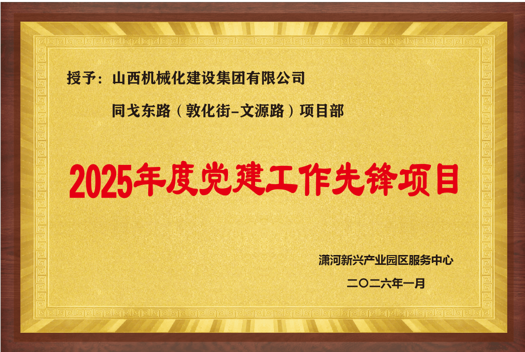 近日,集团公司同戈东路(敦化街-文源路)项目部被潇河新兴产业园区服务中心授予“2025年度党建工作先锋项目”荣誉称号。这既是对项目党建与生产经营深度融合、党建引领项目攻坚实绩的充分肯定,也是对全体项目人员担当作为的有力鼓舞。同戈东路(敦化街-文源路)项目位于潇河新兴产业园区,太原市清徐县刘村及同戈站村境内,北起紧邻潇河国际会展中心敦化街,南至连接太太路与208国道的文源路,全长2.376公里,道路宽度34米,...