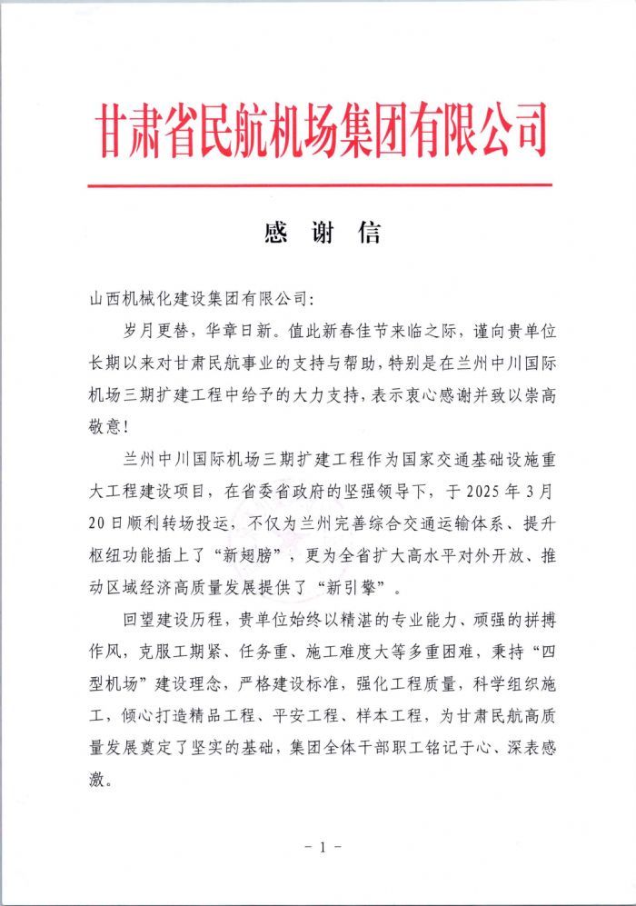巳蛇岁末,捷报频传。甘肃省民航机场集团有限公司、西部机场集团有限公司机场建设指挥部相继向我集团发来感谢信,高度赞誉集团公司在兰州中川国际机场三期扩建工程、西安咸阳国际机场三期扩建工程建设中作出的突出贡献,向集团公司全体干部职工致以新春的美好祝福。在兰州中川国际机场三期扩建工程建设中,集团公司凭借精湛的专业技术与顽强的攻坚作风,全力攻克工期紧、任务重、施工难度大等诸多难题。项目建设过程中,集团公...